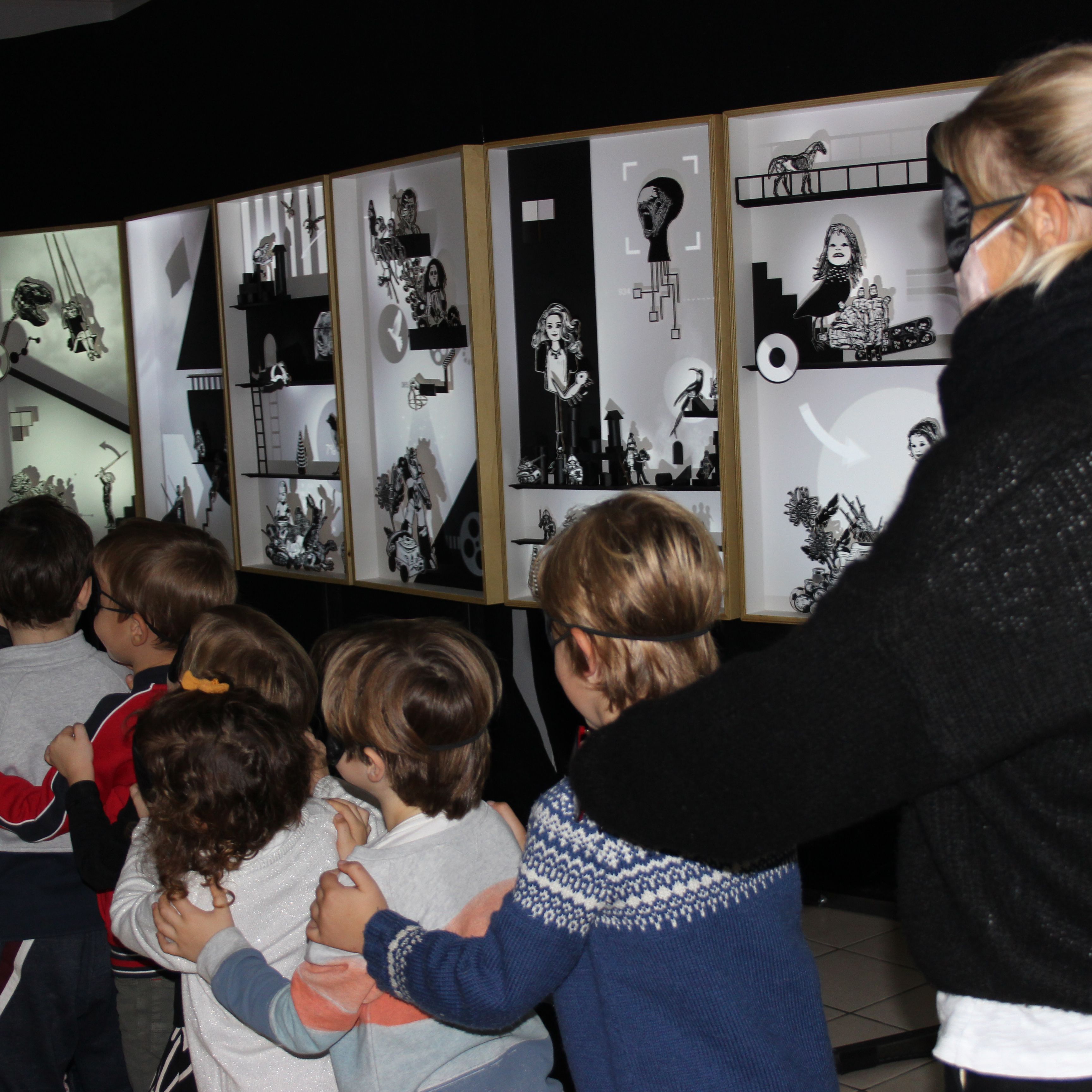 Découverte de l’univers foisonnant des deux artistes : les personnages de fiction, les jouets, les humains hybrides, les chiffres, les flèches, les éléments atmosphériques, les compositions de lumière grâce aux projections,…